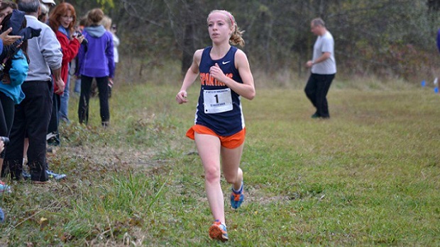 West Springfield senior Caroline Alcorta improved upon both her PR and state leading time in the 5K this fall with a swift 17:10 clocking at the Third Battle Invitational. She did it solo as the next closest finisher was her teammate Katie Kennedy in second place with a time of 18:43. The West Springfield girls were able to decisively defeat their 6A North competitors from Osbourn Park for the team title by a margin of 39 points and team average of 18:56 on the Third Battle of Winchester Park course. (Photo by Tim Dillistin)